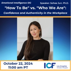I have the privilege of hosting the Emotional Intelligence Special Interest Group for ICFLA.  We are kicked off our 2024 explorations and learning journey on February 27th, with guest, Dr. Heather Backstrom, author of Collaborative Confidence, who presented on “Using Stakeholder Mapping to Help Clients Enhance Self-Awareness.”  We will finish out the year on October 22nd with guest, Dr. Sohee Jun, who will offer her insights on “How to Be” vs. “Who We Are”: Confidence and Authenticity in the Workplace. You do not need to be a coach or a member of ICFLA to attend these sessions. Please join me for our remaining sessions in 2024!